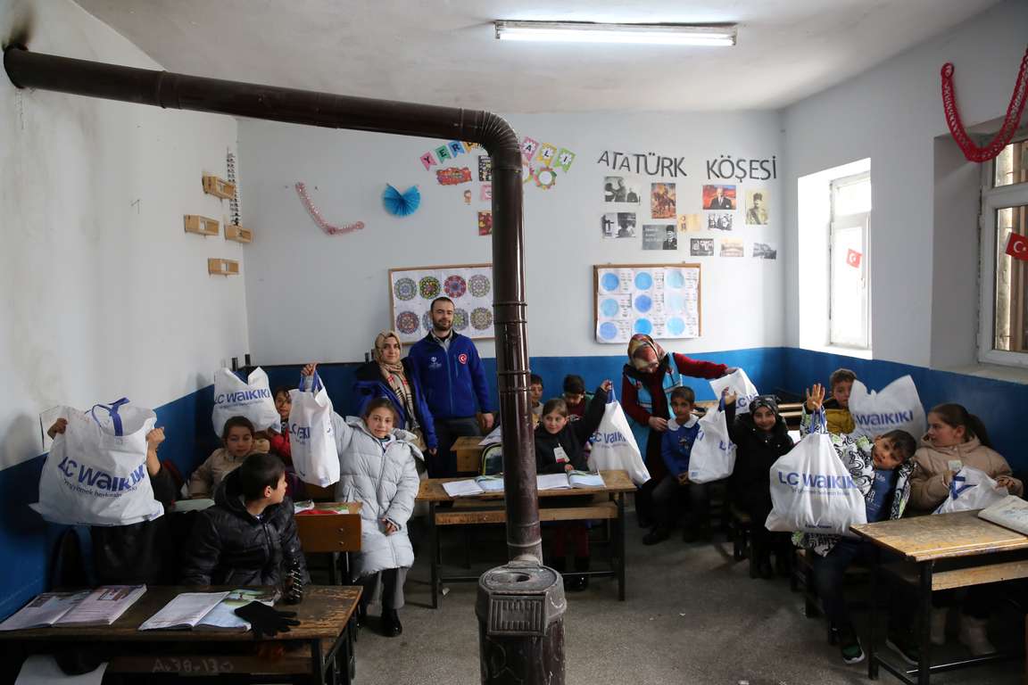 Erzurum’un Köprüköy ilçesinde bulunan köy okullarını ziyaret eden İzani Turan, öğrencilere kışlık kıyafetler ile çeşitli hediyeler dağıttı.