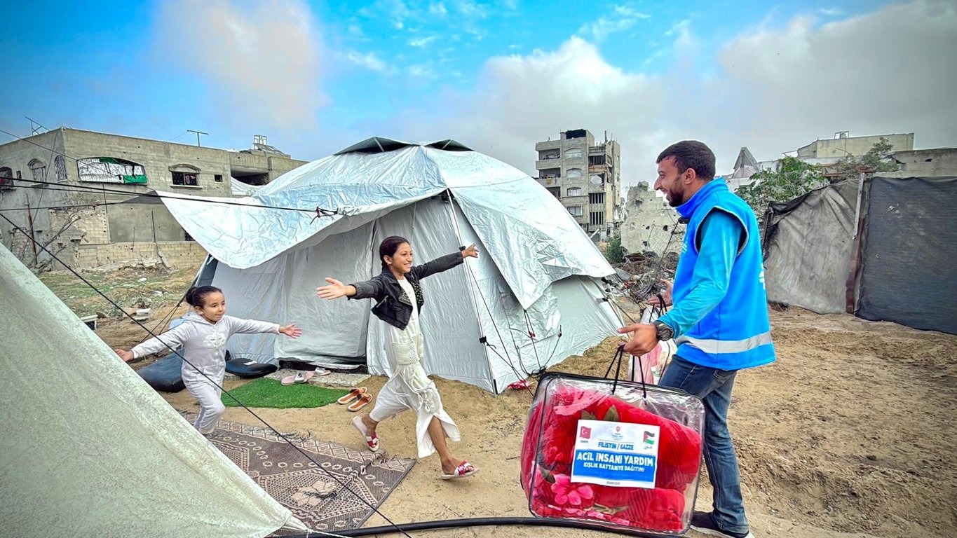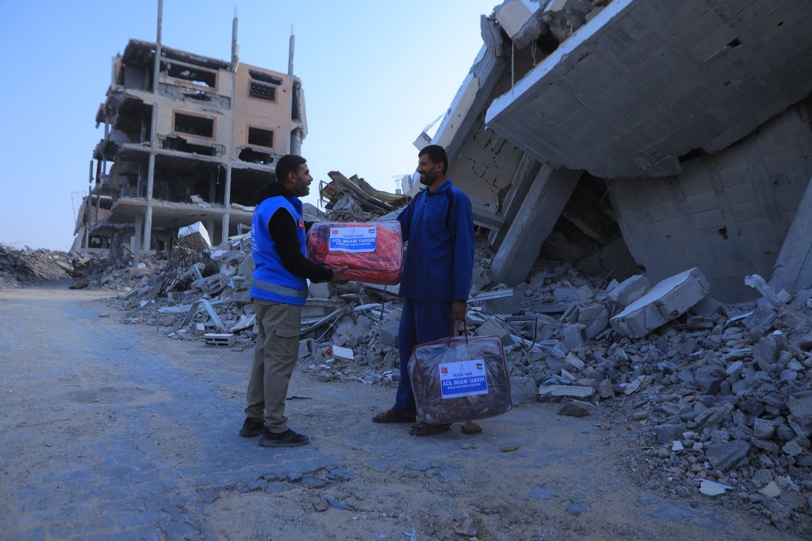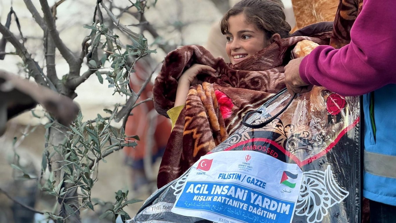 Türk ve Filistin bayraklarıyla süslenen kamyonlarla taşınan battaniyeler, enkaza dönen Gazze sokaklarında TDV'nin işbirliği yaptığı paydaş kuruluşlar aracılığıyla ihtiyaç sahibi ailelere ulaştırıldı.
